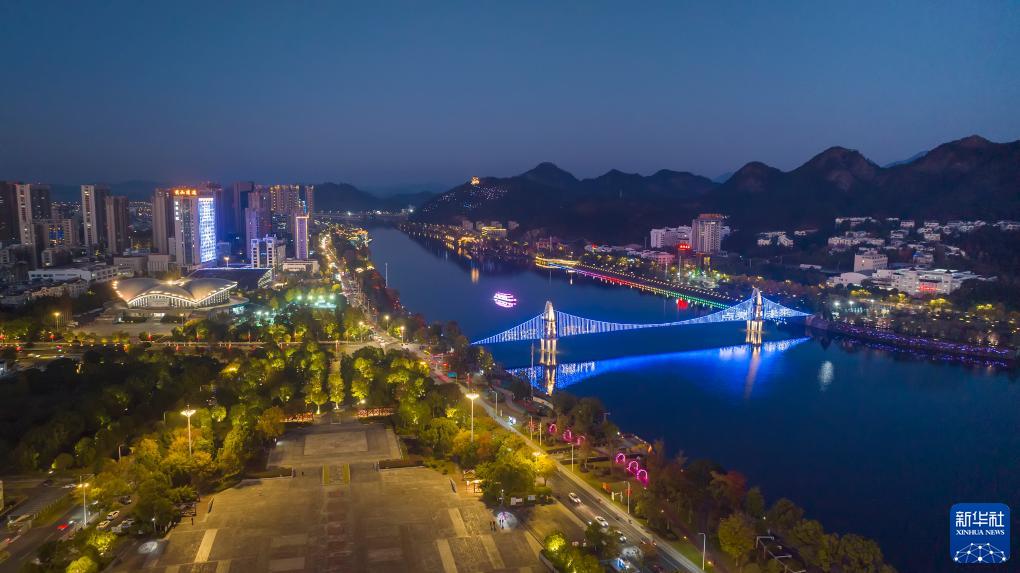 11月20日,安徽省黃山市屯溪區新安江觀(guān)光索橋為世界兒童日亮燈(無(wú)人機照片)。