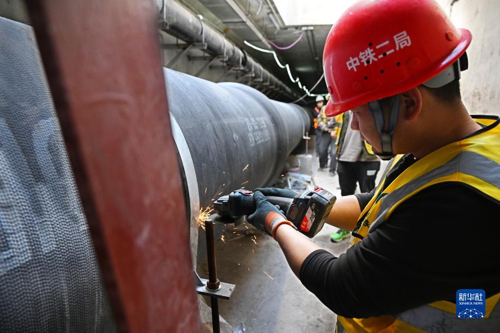 中鐵二局建設者在青島市唐河路——安順路打通工程(涉鐵段)綜合管廊內施工(11月20日攝)。