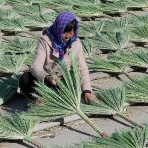 11月21日,河北省樂(lè )亭縣毛莊鎮一家笤帚專(zhuān)業(yè)合作社的社員在制作笤帚。