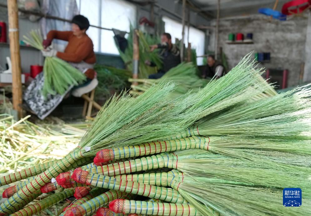 11月21日,河北省樂(lè )亭縣毛莊鎮一家笤帚專(zhuān)業(yè)合作社的社員在制作笤帚。
