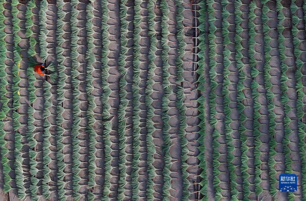 11月21日,河北省樂(lè )亭縣毛莊鎮一家笤帚專(zhuān)業(yè)合作社的社員在晾曬笤帚(無(wú)人機照片)。