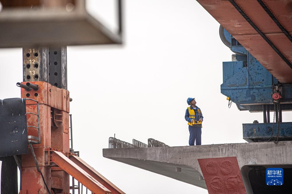 11月21日,在渝昆高鐵川渝段樓灣特大橋建設施工現場(chǎng),施工人員進(jìn)行箱梁架設作業(yè)。