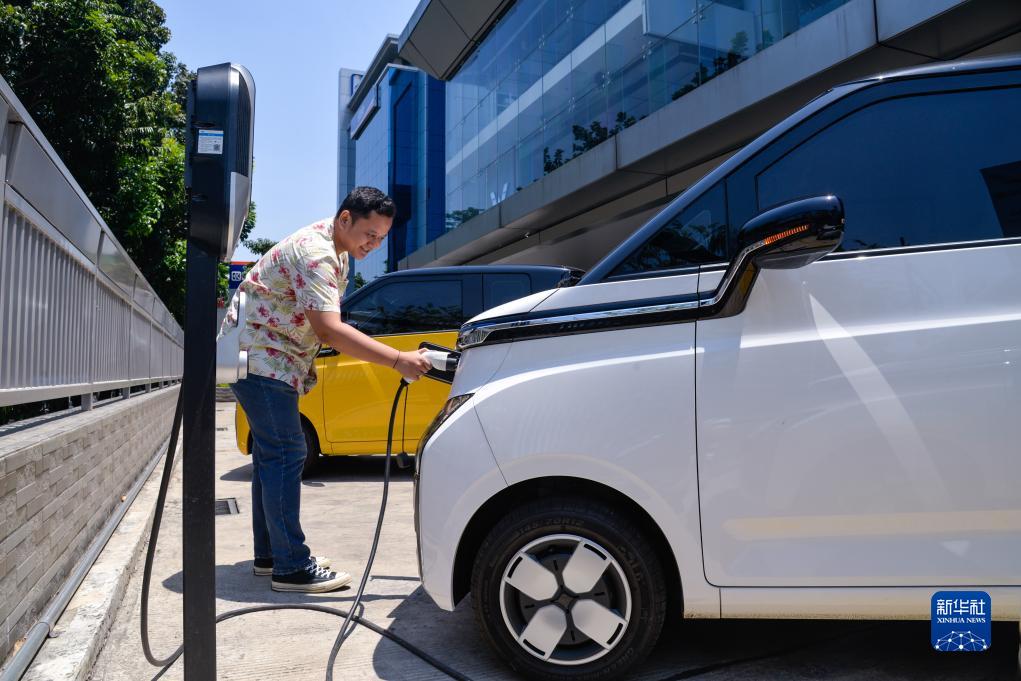 9月29日,在印度尼西亞雅加達五菱中心4S店停車(chē)場(chǎng),一位車(chē)主在為自己的五菱新能源車(chē)Air ev充電。新華社記者 徐欽 攝
