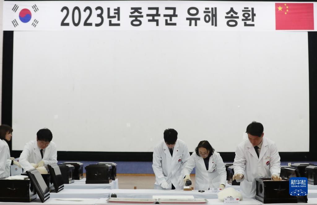 11月22日,在韓國仁川,韓方工作人員將志愿軍烈士遺骸入殮。