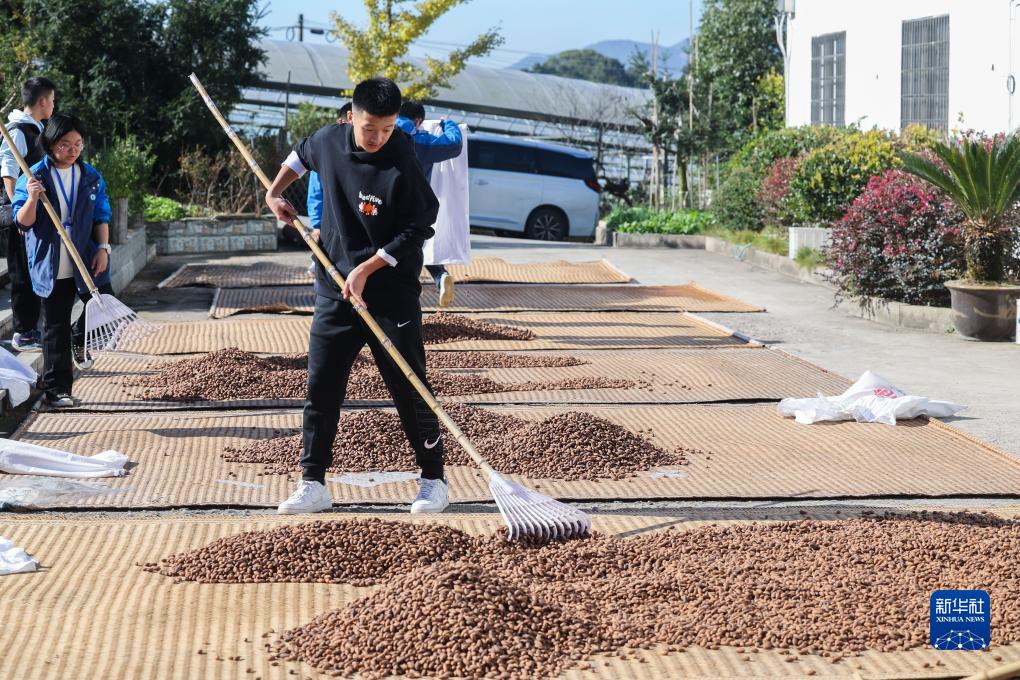 11月22日,學(xué)生在趙家鎮花明泉村明樂(lè )果業(yè)實(shí)踐基地幫助果農曬香榧。