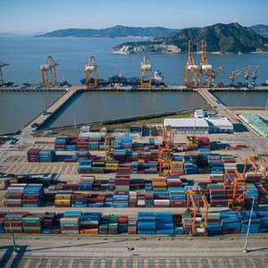 11月22日,裝載集裝箱的卡車(chē)行駛在溫州港狀元岙集裝箱碼頭內。