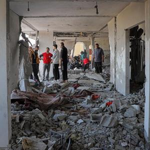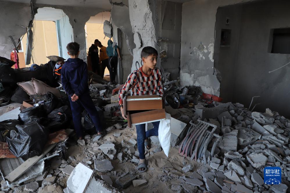 11月22日,在加沙地帶南部城市汗尤尼斯,巴勒斯坦人查看遭以色列襲擊后的建筑廢墟。