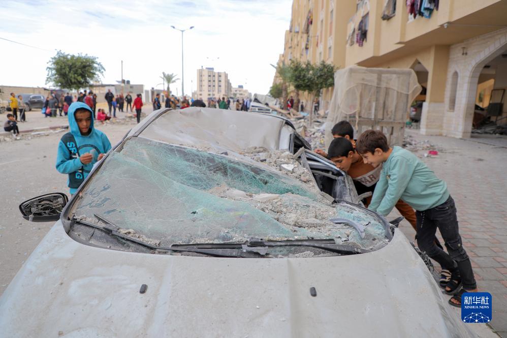 11月22日,在加沙地帶南部城市汗尤尼斯,巴勒斯坦人查看遭以色列襲擊后的受損車(chē)輛。