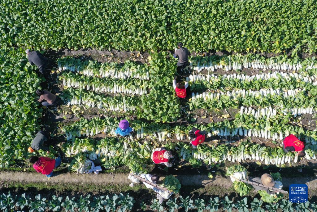 11月22日,在浙江省湖州市德清縣乾元鎮金火村,志愿者幫助村民收割蔬菜(無(wú)人機照片)。