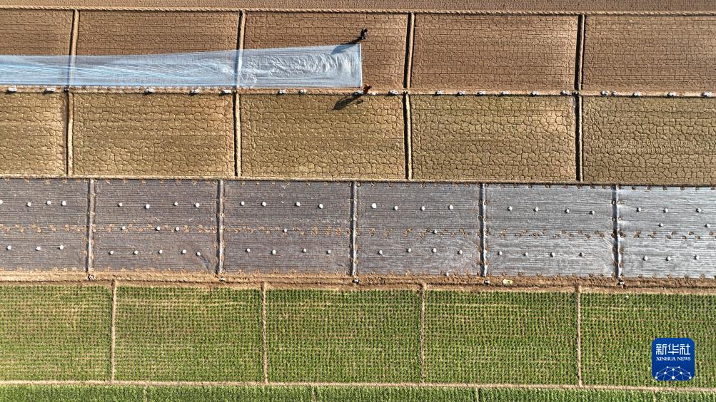11月22日,農戶(hù)在河北省石家莊市藁城區常安鎮里莊村菜田鋪設地膜(無(wú)人機照片)。