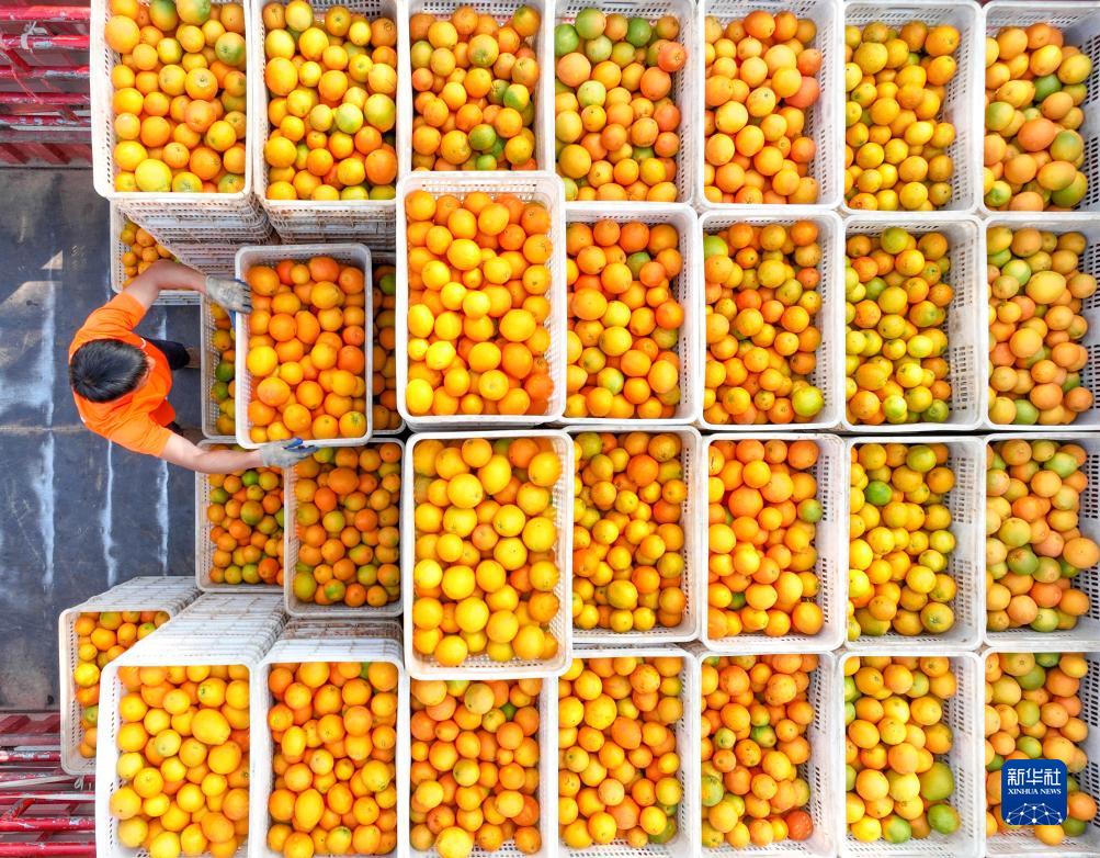 11月22日,在湖南省永州市道縣梅花鎮廊洞村,村民在裝運臍橙(無(wú)人機照片)。