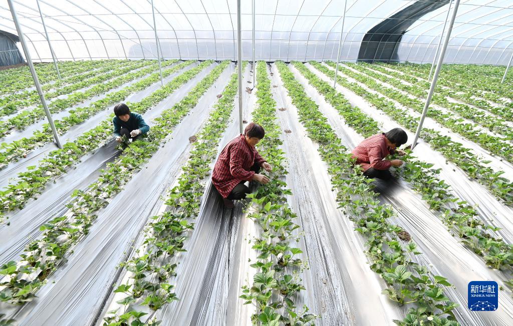 11月22日,河北省邯鄲市磁縣講武城鎮北白道村的村民在大棚內管護草莓。