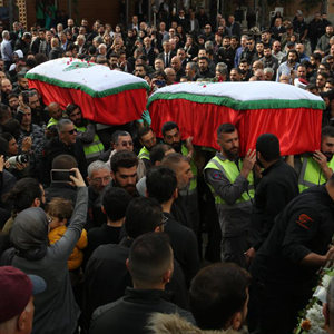 11月22日,在黎巴嫩貝魯特,人們?yōu)閮擅谝攒娨u擊中喪生的記者舉行葬禮。