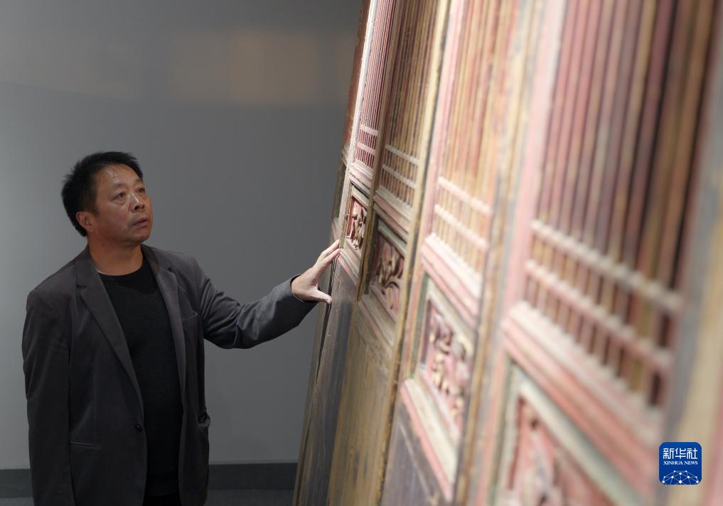 11月22日,在滑縣半坡店古典家具特色小鎮,家具匠人嚴書(shū)寶在查看自己收藏的古典家具。