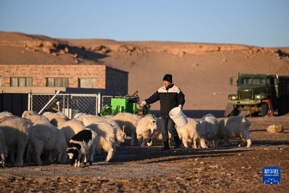 在內蒙古阿拉善左旗烏力吉蘇木溫都爾毛道嘎查,牧民朝勒門(mén)格爾勒在喂羊(11月17日攝)。