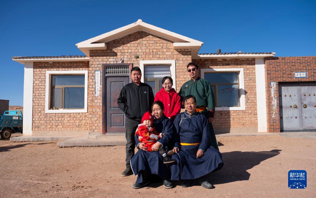 在內蒙古阿拉善左旗烏力吉蘇木溫都爾毛道嘎查,牧民朝勒門(mén)格爾勒(前排右)與家人合影留念(11月17日攝)。