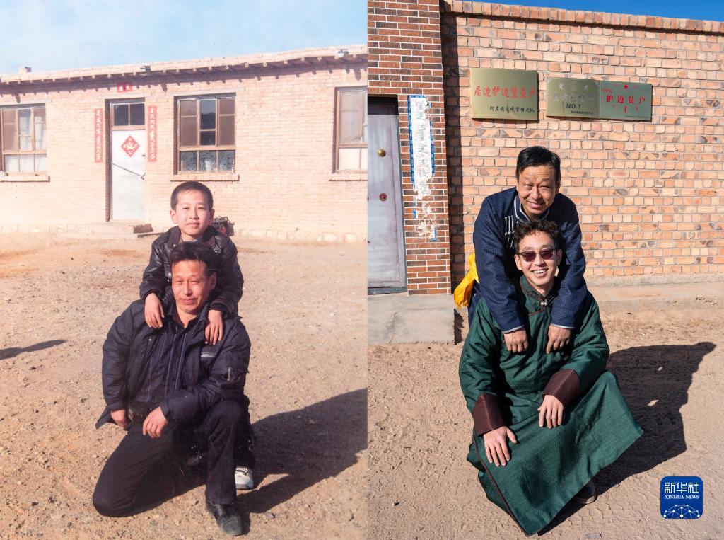 拼版照片:左圖為2006年牧民朝勒門(mén)格爾勒和7歲的兒子溫都蘇在家門(mén)口合影;右圖為2023年11月17日,24歲的溫都蘇(下)和父親合影留念。
