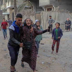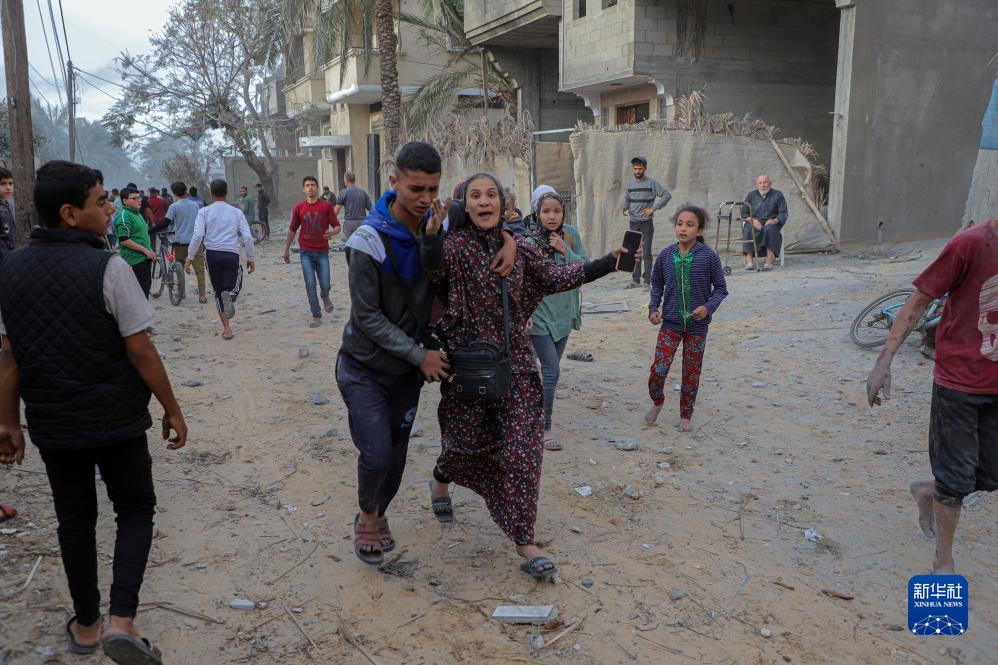 11月22日,在加沙地帶南部城市汗尤尼斯,人們救援以軍空襲后的傷者。