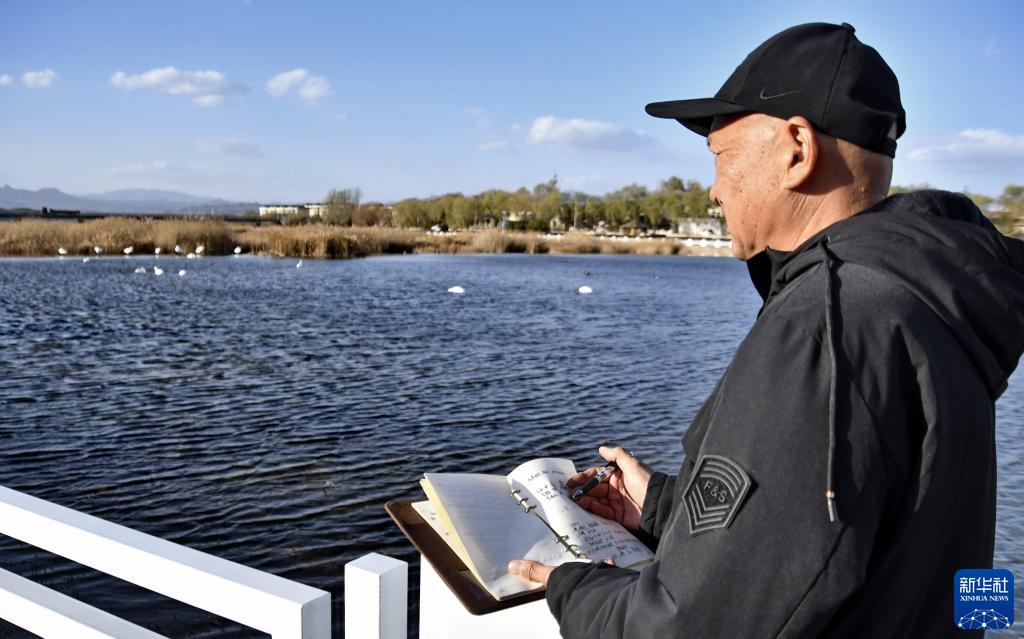 密云水庫管理處庫區管理所水環(huán)境巡查三組組長(cháng)王全民在觀(guān)測登記候鳥(niǎo)活動(dòng)情況(11月22日攝)。