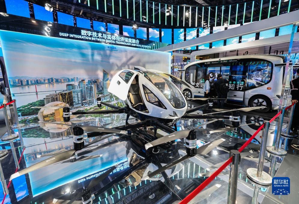 11月23日,在第二屆全球數字貿易博覽會(huì )綜合館內拍攝的飛行器和無(wú)人機駕駛汽車(chē)。