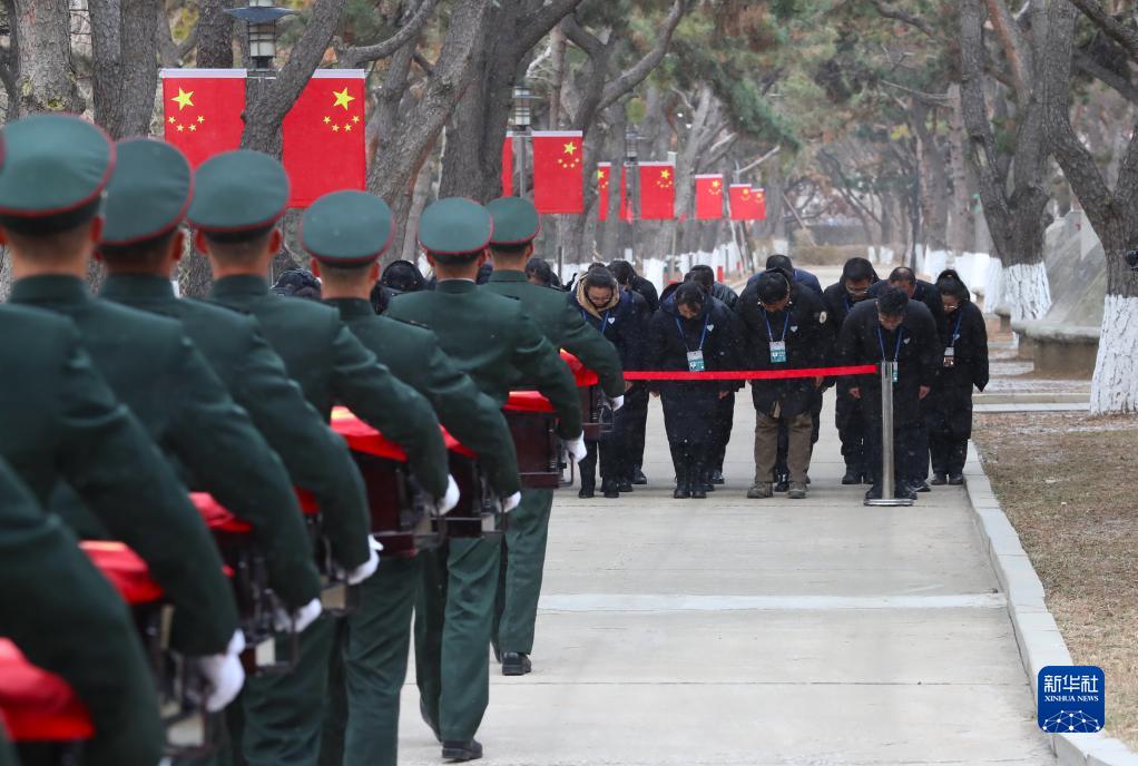 11月23日,沈陽(yáng)抗美援朝烈士陵園工作人員向殮放志愿軍烈士遺骸的棺槨鞠躬。