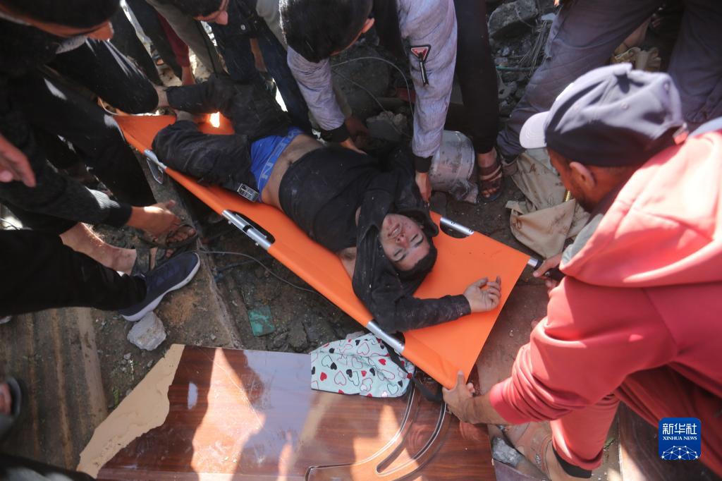 11月23日,人們從加沙地帶南部城市拉法一處廢墟中救出一名傷者。