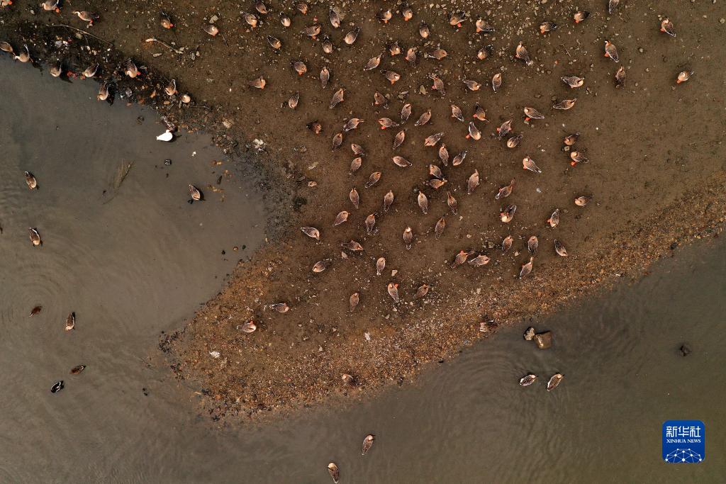 11月23日,候鳥(niǎo)在沈陽(yáng)渾河的灘地上棲息、覓食(無(wú)人機照片)。