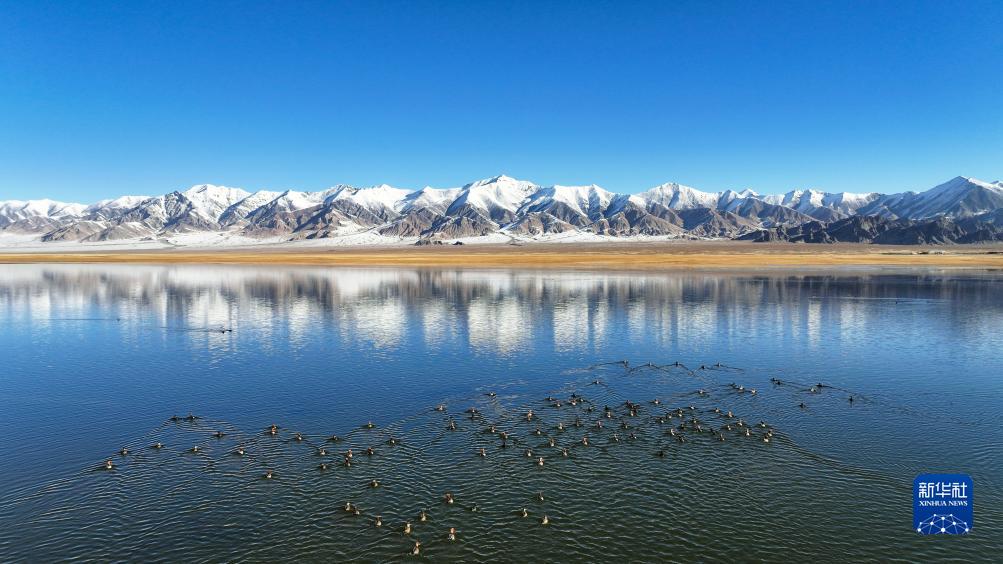 阿爾金山國家級自然保護區,針尾鴨等水鳥(niǎo)在依協(xié)克帕提湖棲息(10月18日攝,無(wú)人機照片)。