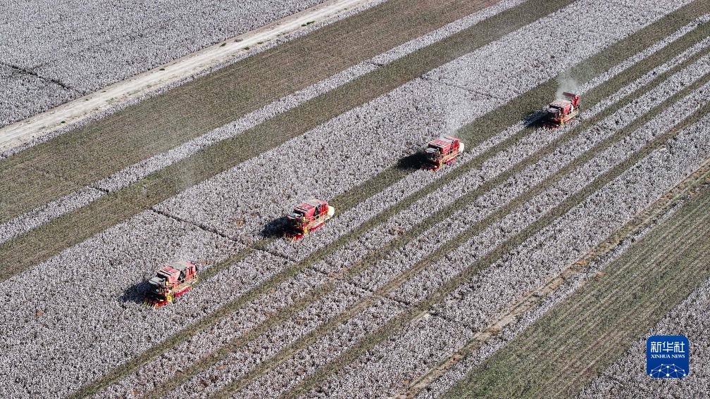 新疆庫爾勒市普惠農場(chǎng)一處棉田,農民駕駛大型采棉機采摘棉花(10月12日攝,無(wú)人機照片)。