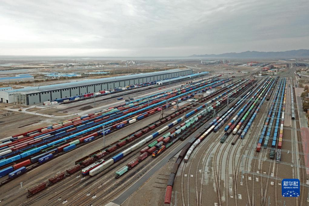 新疆阿拉山口站編組場(chǎng)內集結待發(fā)的貨運列車(chē)(11月4日攝,無(wú)人機照片)。阿拉山口口岸位于新疆博爾塔拉蒙古自治州,毗鄰哈薩克斯坦,是中國連通中亞、直達歐洲的主要運輸通道,在絲綢之路經(jīng)濟帶核心區建設中發(fā)揮了重要作用。