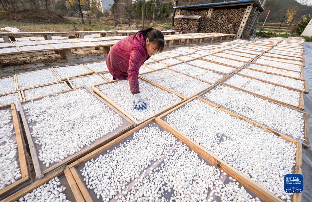 11月23日,在湖北省羅田縣九資河鎮天堂湖村,藥農在晾曬茯苓。