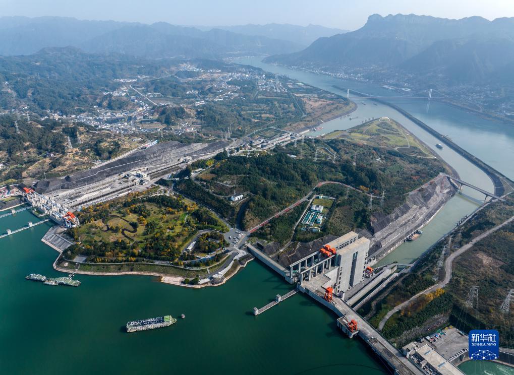 11月24日,在湖北省宜昌市,船舶有序通過(guò)三峽船閘和升船機(無(wú)人機照片)。
