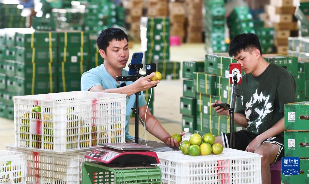 主播在瓊中綠橙加工廠(chǎng)進(jìn)行網(wǎng)絡(luò )直播銷(xiāo)售瓊中綠橙(11月23日)。