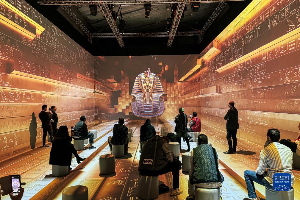 當日,圖坦卡蒙沉浸式展覽在大埃及博物館開(kāi)幕。觀(guān)眾可通過(guò)現場(chǎng)絢麗的視覺(jué)效果和配樂(lè )沉浸式了解法老圖坦卡蒙的故事,以及古埃及的歷史文化。