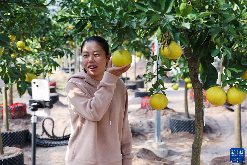 11月25日,在金華市金東區澧浦鎮前余村的“云上果園”果苗直播基地內,種植戶(hù)張靜在直播銷(xiāo)售葡萄柚果樹(shù)。