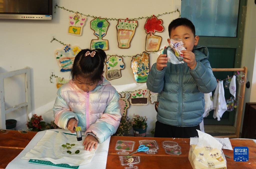 11月24日,小朋友在上海市實(shí)驗幼兒園的“田園中心”采摘植物、制作標本。