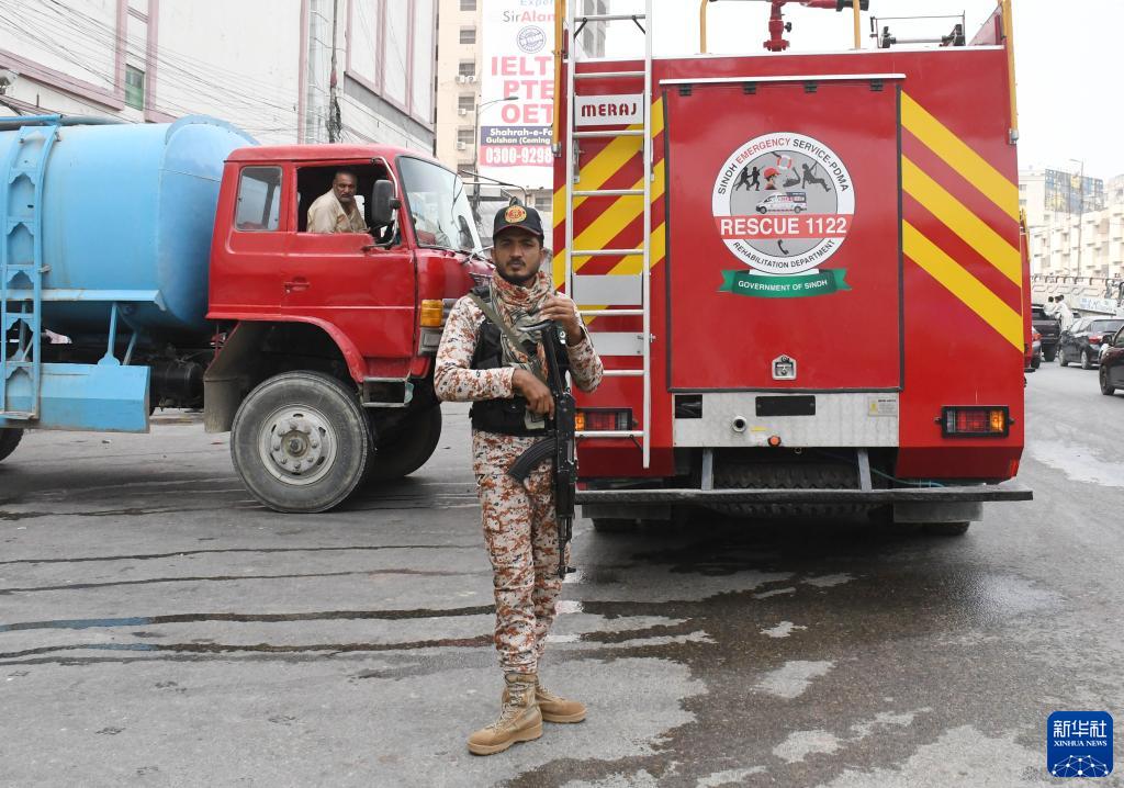 11月25日,在巴基斯坦卡拉奇,一名安全人員在發(fā)生火災的商場(chǎng)外警戒。