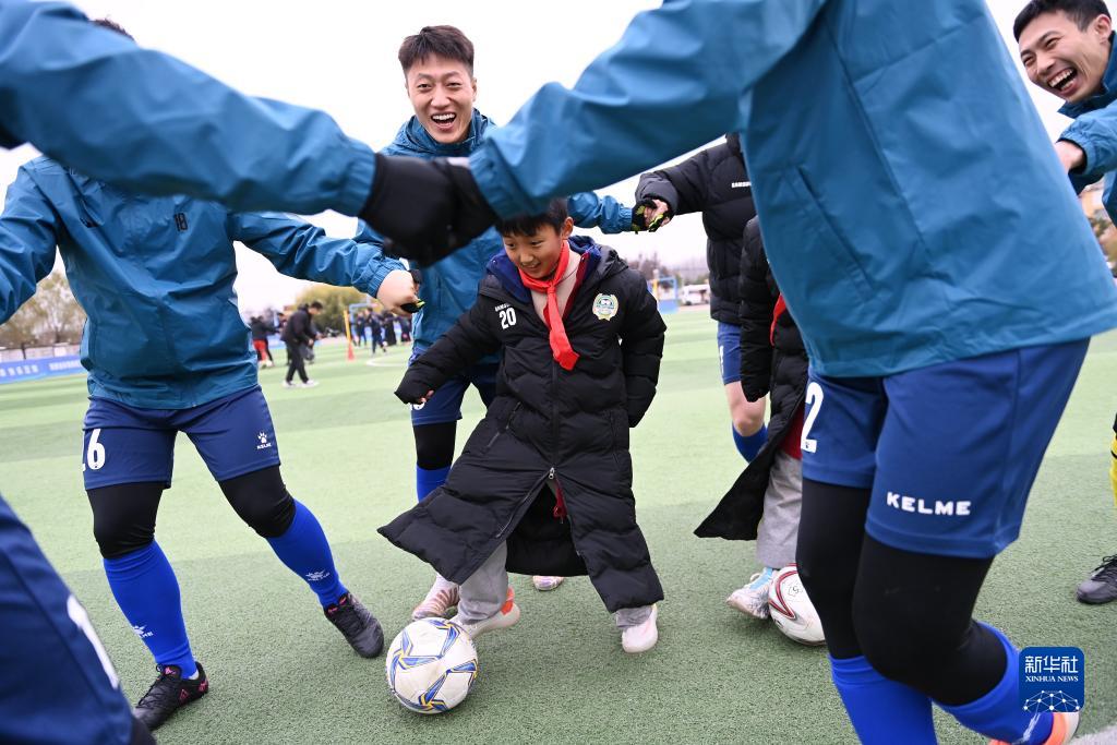 11月25日,受助學(xué)生和三星足球隊球員在鄉村學(xué)校公益足球課堂啟動(dòng)儀式上參與趣味足球活動(dòng)。