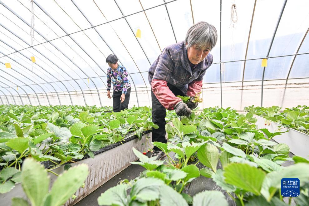在平山縣滹沱河高端設施蔬菜示范區育苗中心,崗南鎮南石殿村村民紀翠鳳在給草莓去除老葉,促進(jìn)通風(fēng)透光(11月25日攝)。