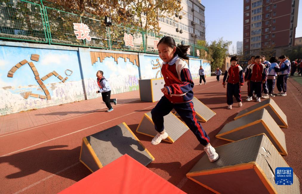11月27日,河北省石家莊市仁華小學(xué)學(xué)生利用大課間進(jìn)行“跨越坦克墩”游戲。