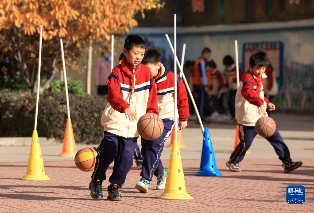 11月27日,河北省石家莊市仁華小學(xué)學(xué)生利用大課間進(jìn)行籃球繞樁練習。