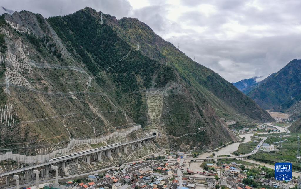 調試列車(chē)駛出川青鐵路鎮江關(guān)站(10月12日攝,無(wú)人機照片)。