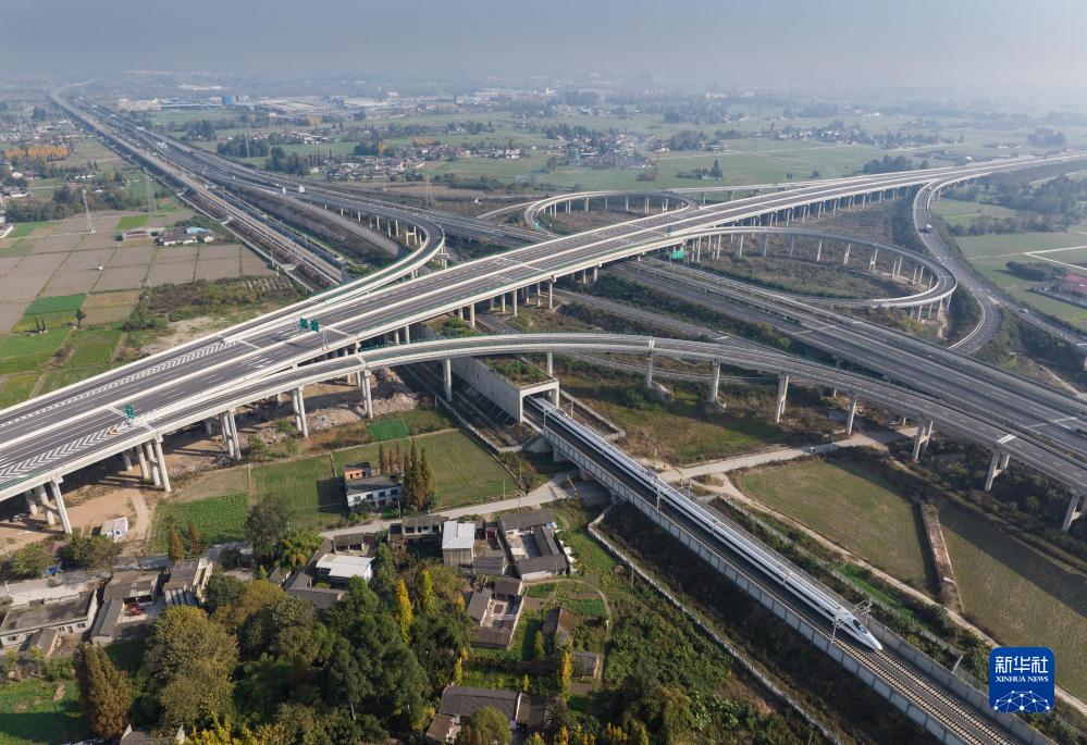 11月28日,首發(fā)列車(chē)C6008次列車(chē)行駛在川青鐵路上,該段與成萬(wàn)高速并行、與成都都市圈環(huán)線(xiàn)高速交會(huì )(無(wú)人機照片)。