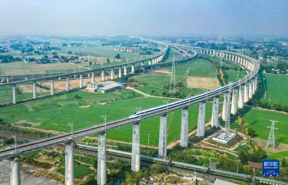 11月28日,成都市青白江區境內行駛在川青鐵路上的列車(chē)(上)與行駛在寶成鐵路線(xiàn)上的列車(chē)(下)交會(huì )(無(wú)人機照片)。