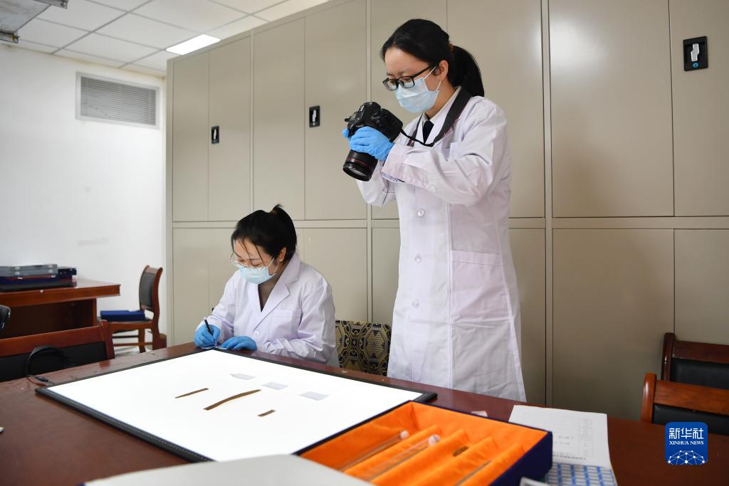 甘肅簡(jiǎn)牘博物館科技保護部文物庫房管理員楊升(右)和同事常曉麗在整理登記簡(jiǎn)牘信息(10月26日攝)。新華社記者 陳斌 攝