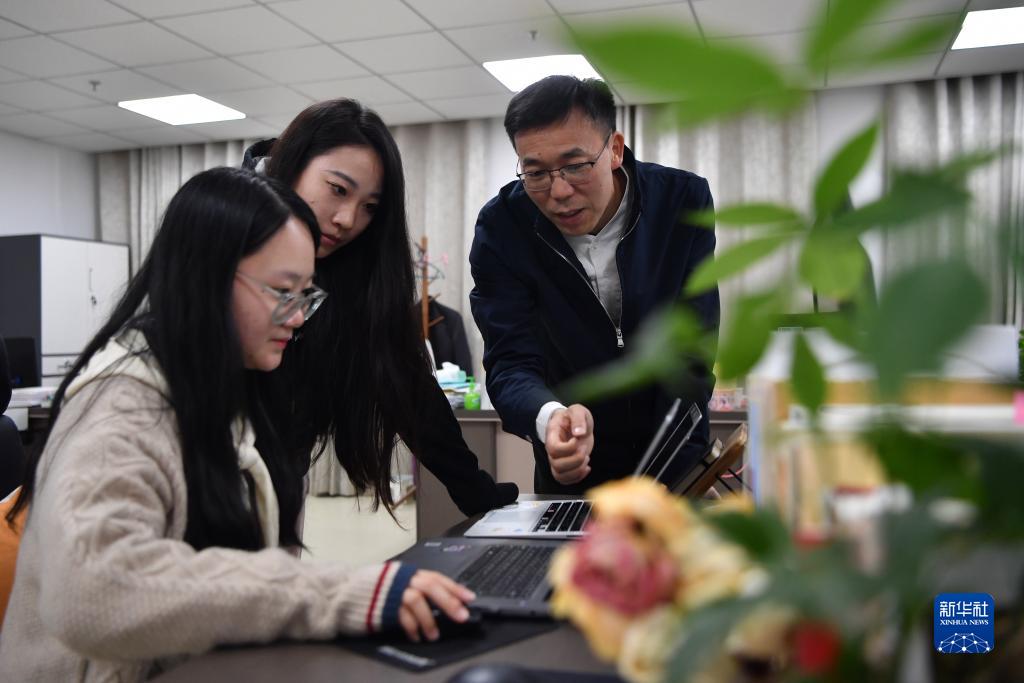 甘肅簡(jiǎn)牘博物館整理研究部主任肖從禮(右一)和同事交流簡(jiǎn)牘數字化工作(10月25日攝)。新華社記者 陳斌 攝