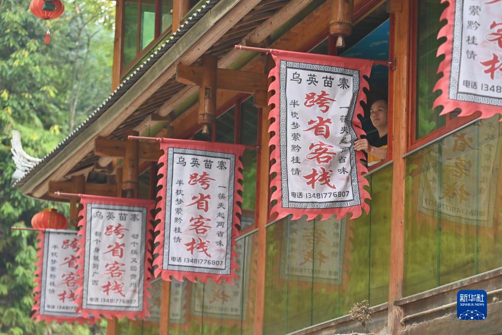 烏英苗寨村民吳新仁整理窗外的民宿招牌(2022年9月11日攝)。吳新仁曾在外打工,多年前回到家鄉創(chuàng )業(yè),在村里辦起了第一家民宿。