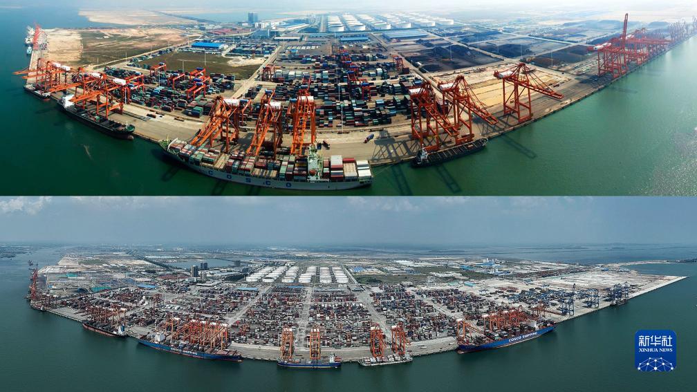 拼圖照片:上圖為2015年的欽州港(2015年10月23日攝,無(wú)人機照片);下圖為2022年的欽州港(2022年9月13日攝,無(wú)人機照片)。