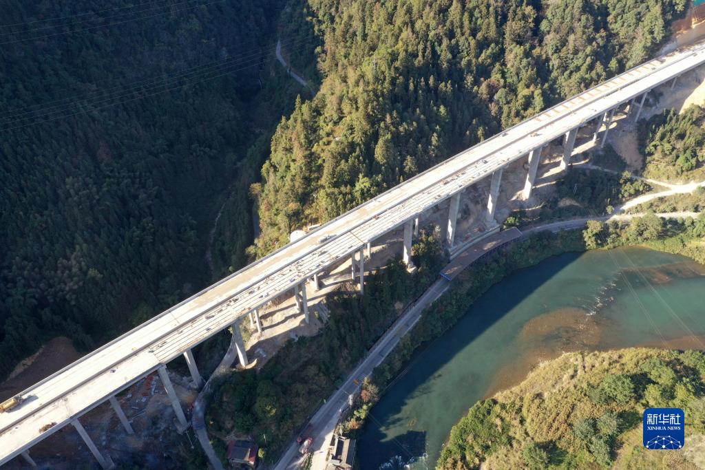 這是建設中的廣西龍勝各族自治縣境內的龍勝至城步高速公路(無(wú)人機照片,11月28日攝)。