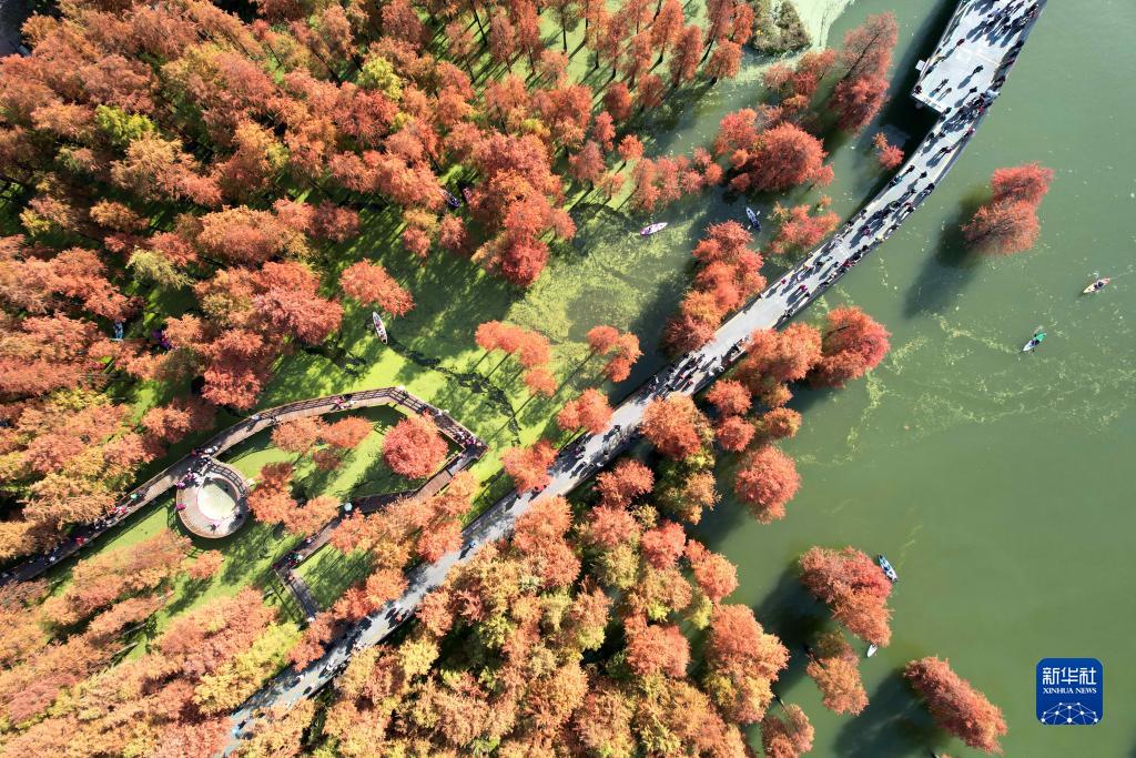 浙江省杭州市臨安區青山湖景區水上森林色彩斑斕(11月28日攝,無(wú)人機照片)。
